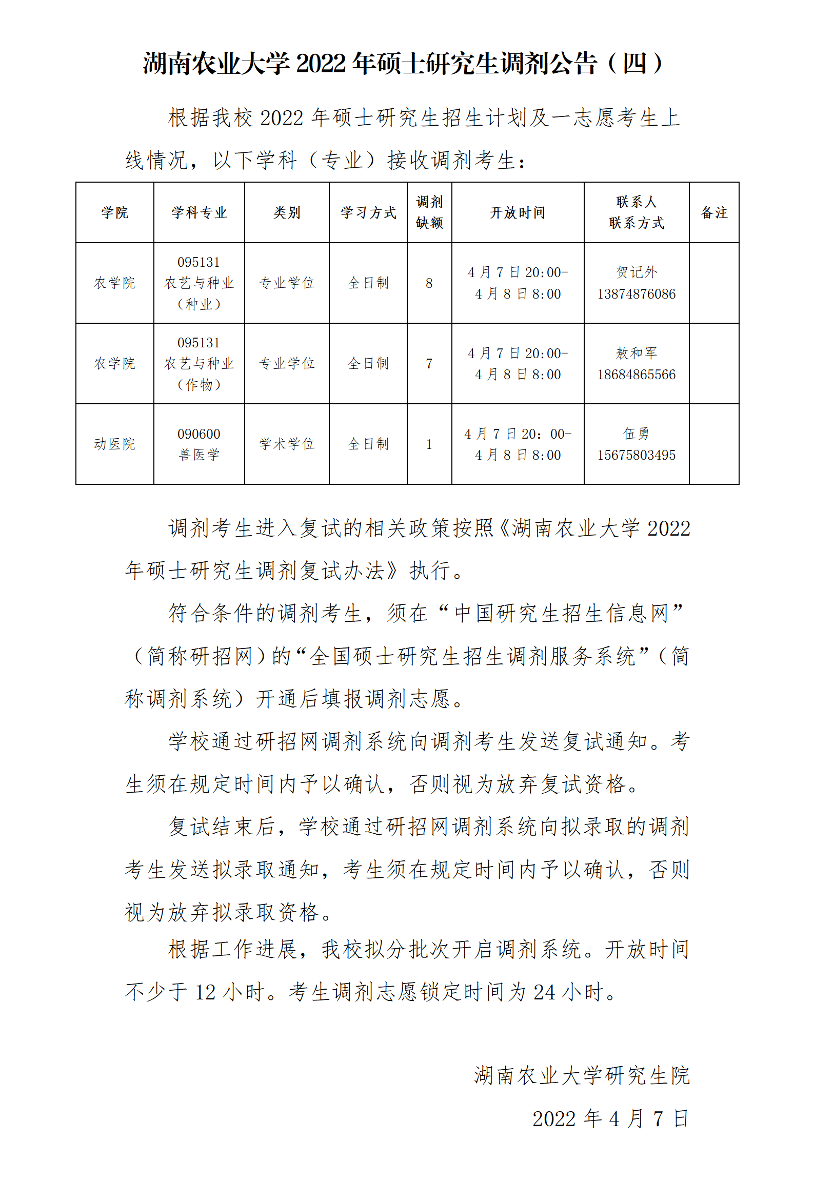 以上就是小編整理“2022考研調劑:湖南農業大學2022年碩士研究生調劑公告(四)”的全部內容,想了解更多調劑信息,請持續關注本網站。