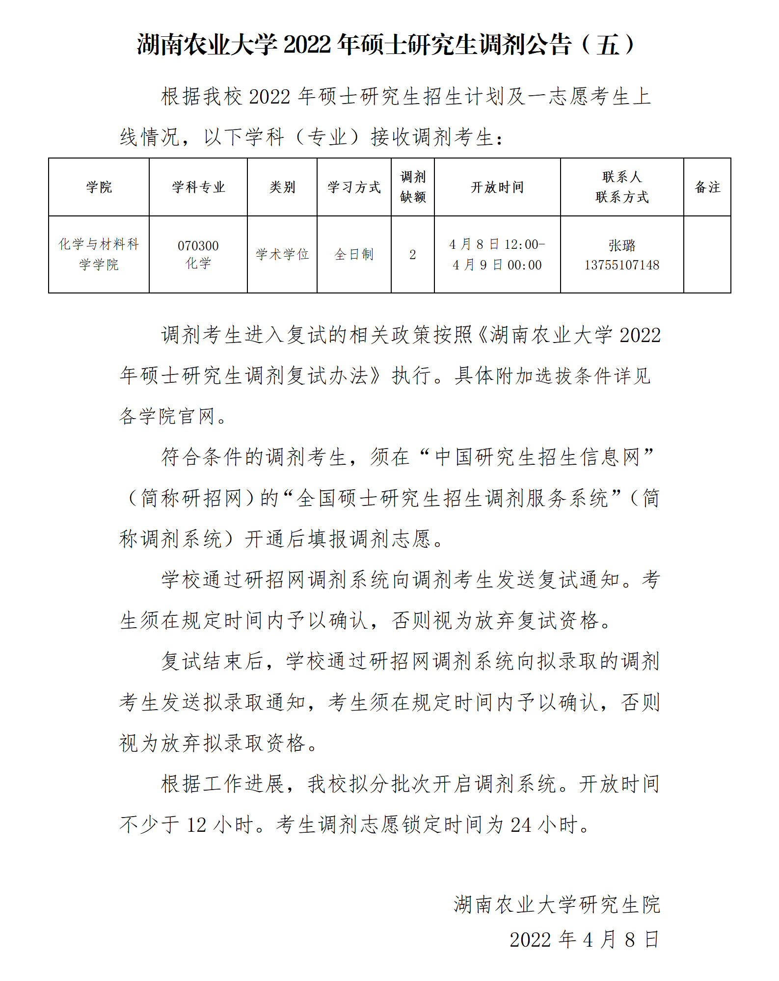 以上就是小編整理“2022考研調劑:湖南農業大學2022年碩士研究生調劑公告(五)”的全部內容,想了解更多調劑信息,請持續關注本網站。