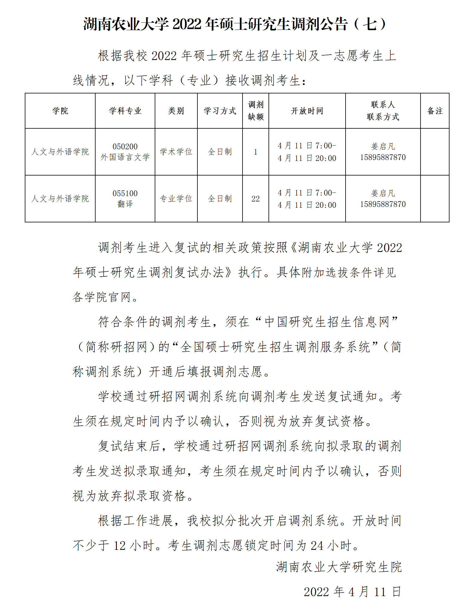 以上就是小編整理“2022考研調劑:湖南農業大學2022年碩士研究生調劑公告(七)”的全部內容,想了解更多調劑信息,請持續關注本網站。