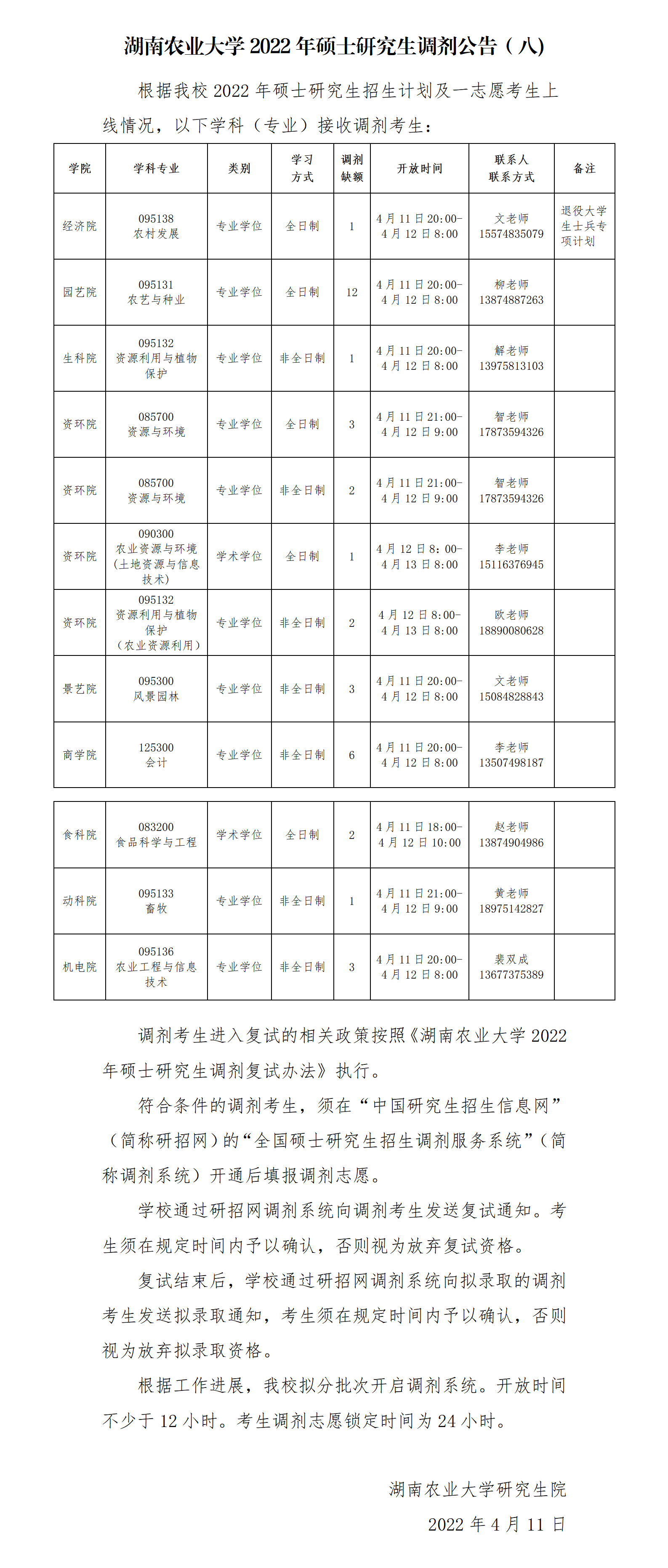 以上就是小編整理“2022考研調劑:湖南農業大學2022年碩士研究生調劑公告(八)”的全部內容,想了解更多調劑信息,請持續關注本網站。