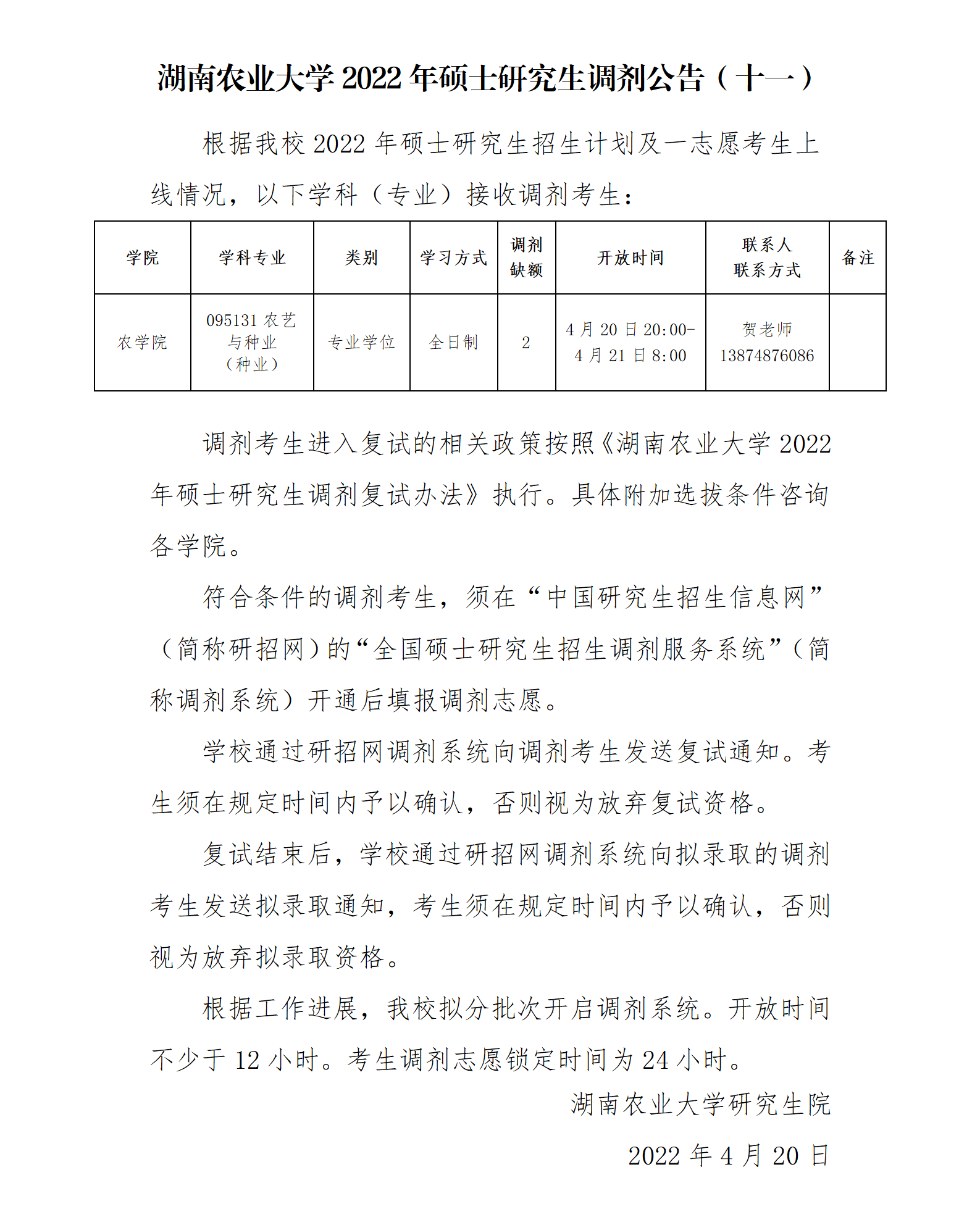 以上就是小編整理“2022考研調劑:湖南農業大學2022年碩士研究生調劑公告(十一)”的全部內容,想了解更多調劑信息,請持續關注本網站。