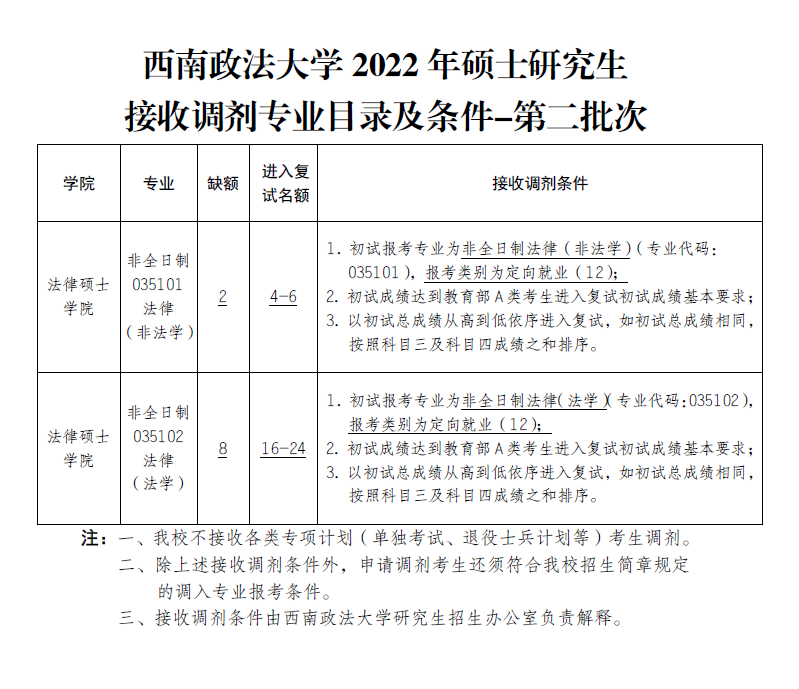 根據《2022年全國碩士研究生招生工作管理規定》(教學[2021]2號)、《西南政法大學2022年碩士研究生復試錄取辦法》以及我校生源余缺情況,接收考生調劑復試。