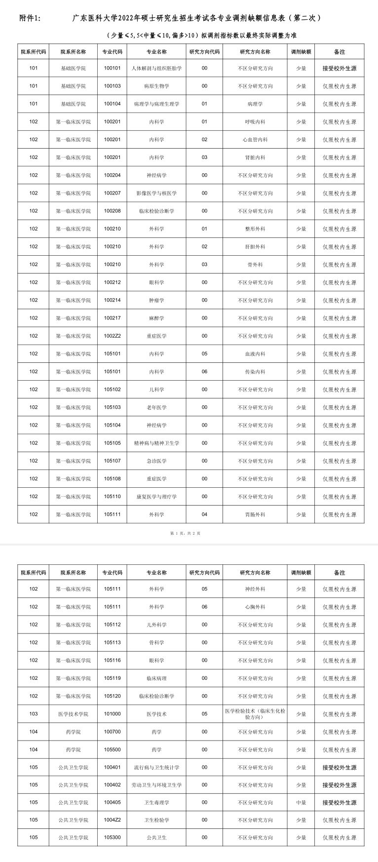 附件1:廣東醫科大學2022年碩士研究生招生考試各專業調劑缺額信息表(第二次)