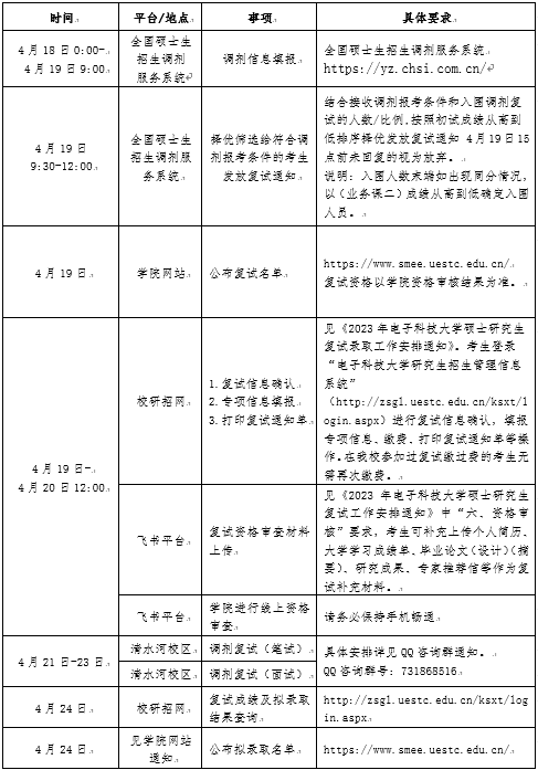 1.調(diào)劑復(fù)試的準(zhǔn)備、材料提交、內(nèi)容流程等信息詳見學(xué)校/學(xué)院《2023年電子科技大學(xué)碩士研究生復(fù)試錄取工作安排通知》。