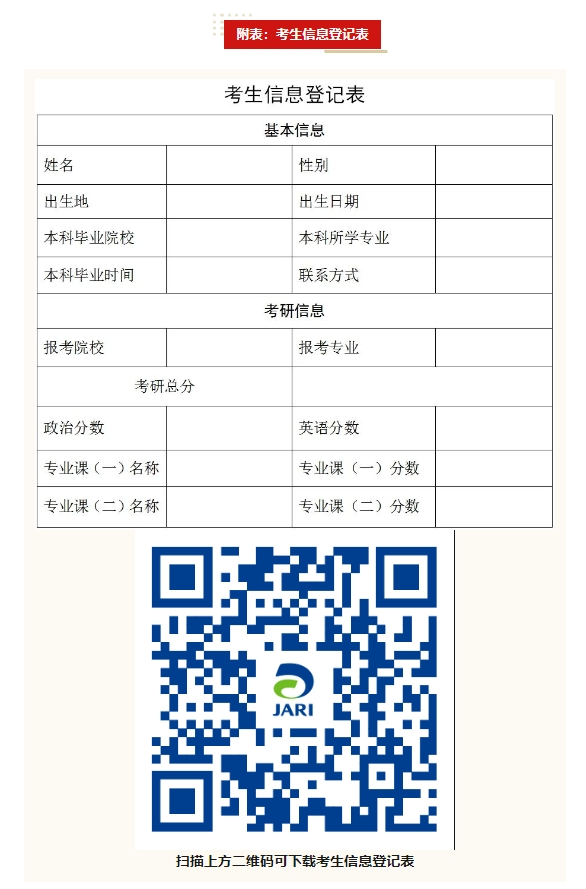 有意向調(diào)劑到本所的考生請按照以下附表填寫調(diào)劑考生信息登記表,并同本人簡歷等材料發(fā)送至郵箱:jariyjs716 163.com。