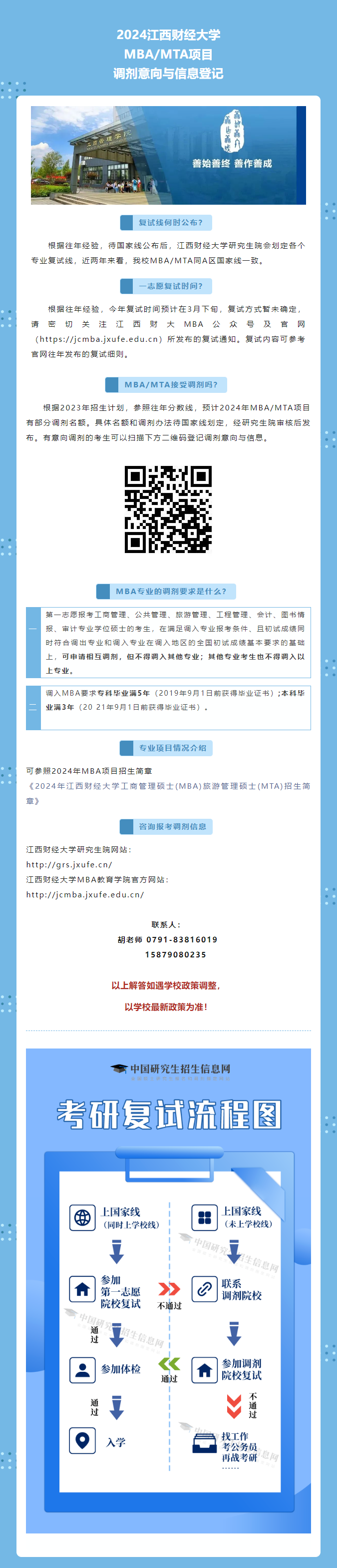 以上就是小編整理“2024考研調劑:2024江西財經大學MBA/MTA項目調劑意向與信息登記”的全部內容,想了解更多調劑信息,請持續關注本網站。