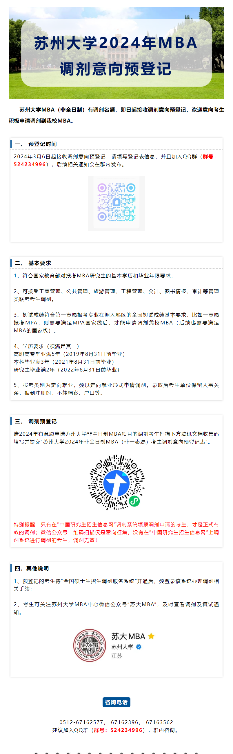以上就是小編整理“2024考研預調劑:蘇州大學2024年MBA調劑意向預登記”的全部內容,想了解更多調劑信息,請持續關注本網站。