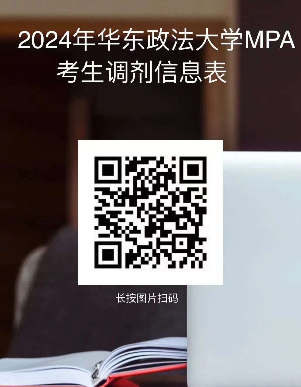 根據(jù)學(xué)校2024年招生計(jì)劃及我校考試情況,現(xiàn)有部分調(diào)劑指標(biāo),歡迎有調(diào)劑意愿的考生調(diào)劑至我校。考生可微信掃描下方二維碼填寫《2024年華東政法大學(xué)MPA考生調(diào)劑信息表》、我們將及時查閱登記考生的調(diào)劑信息,并在學(xué)校復(fù)試方案公布后,根據(jù)學(xué)校正式調(diào)劑通知和調(diào)劑辦法開展調(diào)劑工作。