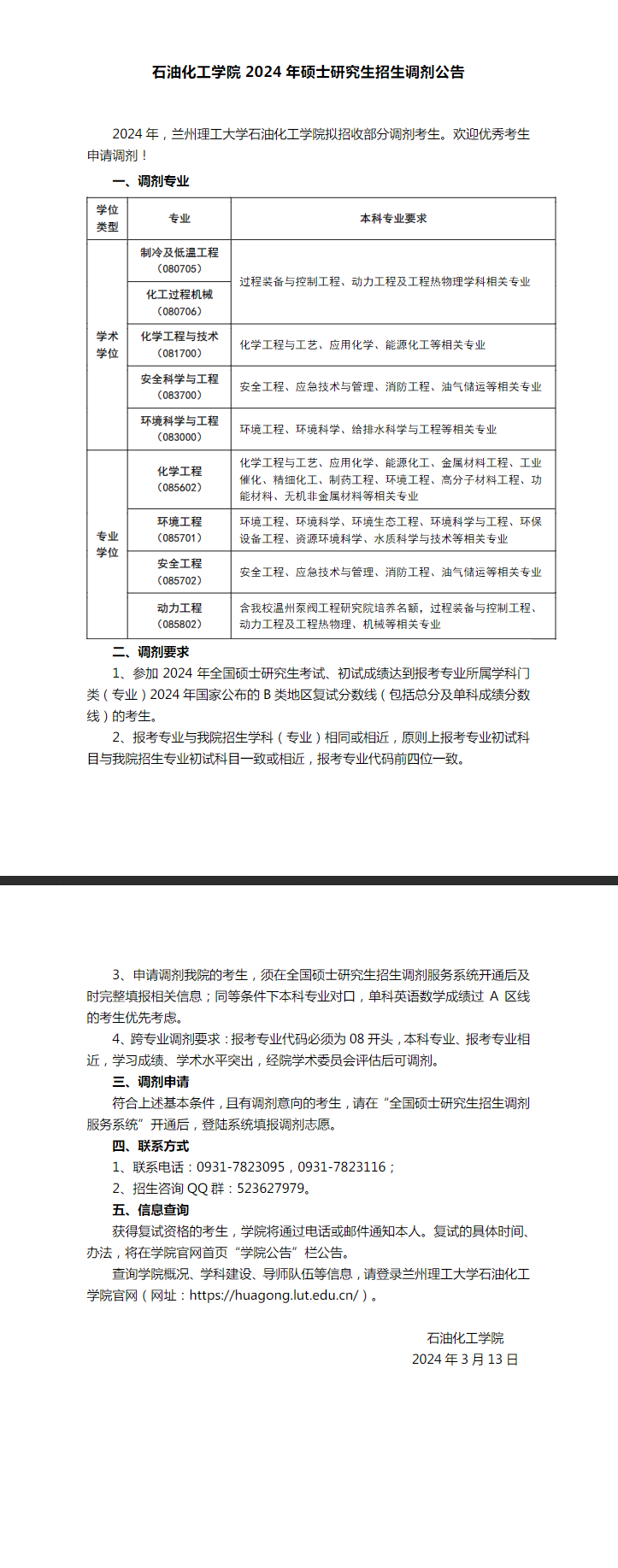 以上就是小編整理“2024考研調劑:蘭州理工大學石化學院2024年碩士研究生招生調劑公告”的全部內容,想了解更多調劑信息,請持續關注本網站。