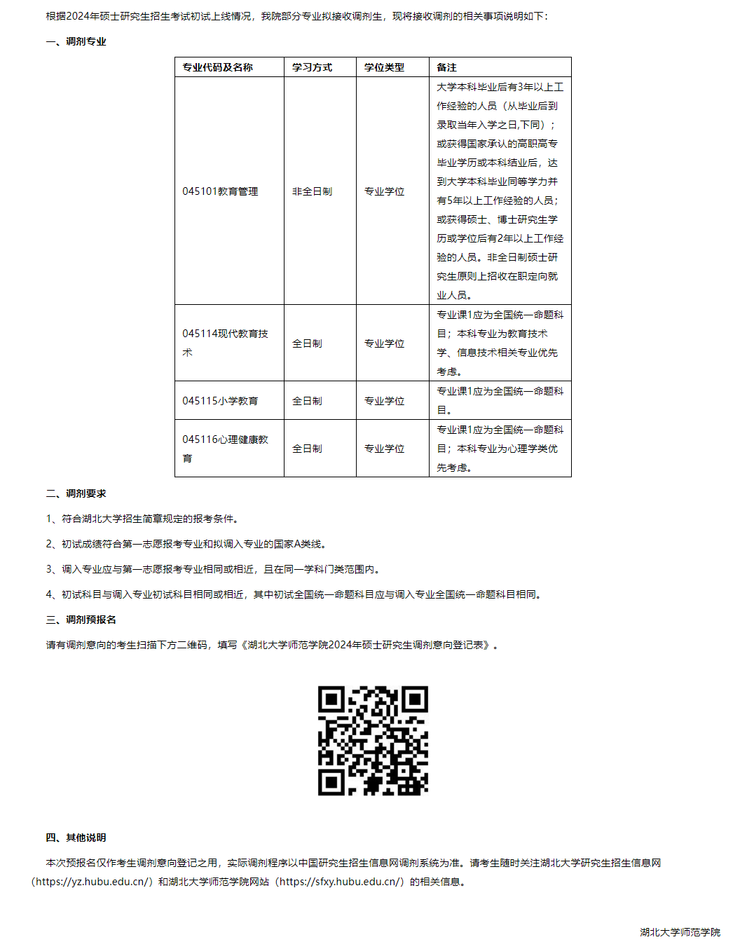 2024考研預調劑:湖北大學師范學院2024年碩士研究生調劑預報名公告