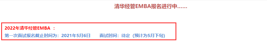 2022年清華經(jīng)管EMBA第一次面試報(bào)名截止時(shí)間為:2021年5月6日