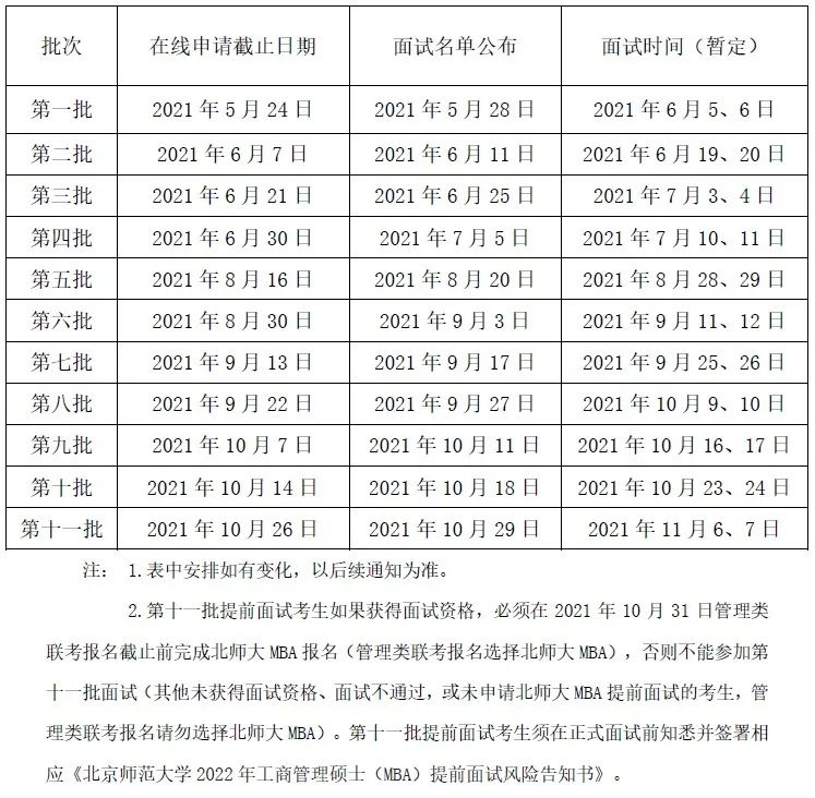 以上就是“2022MBA提前面試:北京師范大學2022年MBA提前面試正式啟動”,更多相關信息,請持續關注本網站,祝大家順利上岸!