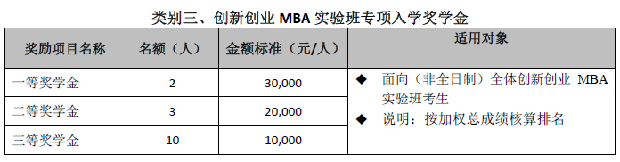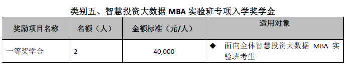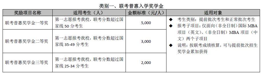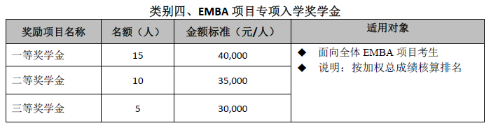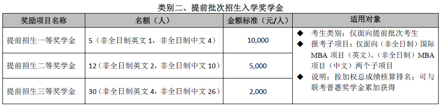 設立五種類別入學獎學金,以資鼓勵報考我校MBA/EMBA項目、全國聯考初試分數成績優秀、提前批次招生面試表現出色的考生。