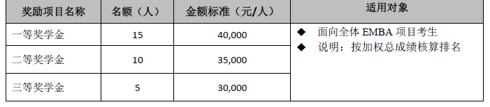 設(shè)立入學(xué)獎學(xué)金,以資鼓勵報考我校EMBA項目、全國聯(lián)考初試分?jǐn)?shù)成績優(yōu)秀、提前批次招生面試表現(xiàn)出色的考生。