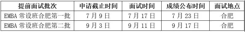 非全日制EMBA常設班考生可申請參加提前批面試也可參加正常批面試(提前面試項目須與報考項目及研究方向一致,不一致提前面試成績無效。同一報考項目及研究方向須且只能參加一次面試)。提前面試成績優秀獲國家線條件錄取資格;提前面試成績合格以上且初試成績達EMBA項目復試分數線其提前面試成績計入錄取成績進行該項目排序錄取。