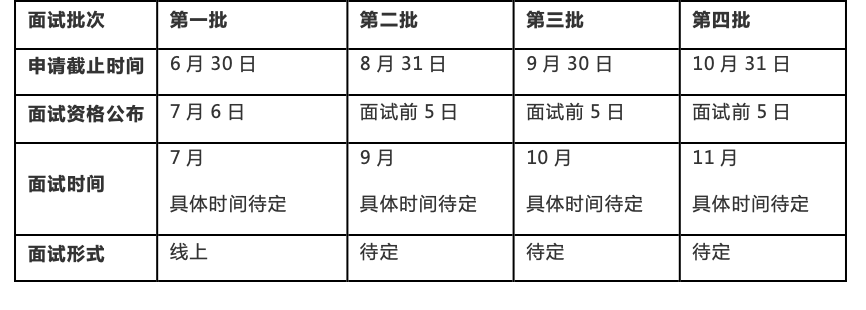 面試形式:根據(jù)目前的疫情防控要求,7月份提前面試采取線上網(wǎng)絡(luò)面試形式,其他批次目前待定,請(qǐng)關(guān)注通知。