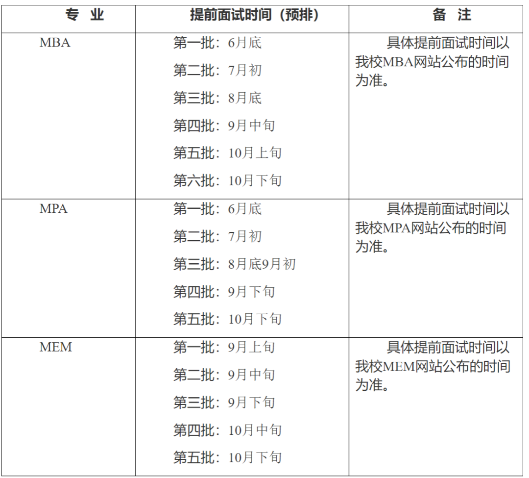 考生能否參加提前面試,以接到管理學院專業學位中心工作人員電話確認為準;參加提前面試的考生最終名單以學校網站公示名單為準。