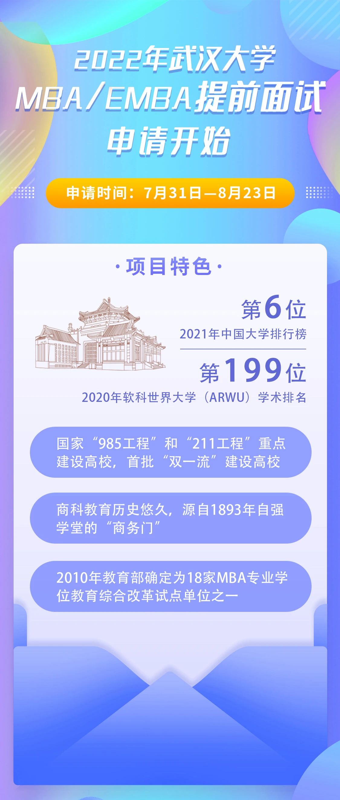 原文標(biāo)題:提面報(bào)名 | 2022年武漢大學(xué)工商管理碩士(MBA、EMBA)提前面試申請(qǐng)開(kāi)始!