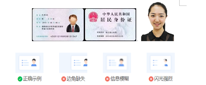 (3)手持身份證照片:拍攝時,將持證的手臂和上半身整個拍進照片,頭部和肩部要端正,頭發不得遮擋臉部或造成陰影,要露出五官;確保身份證上的所有信息可見、完整。