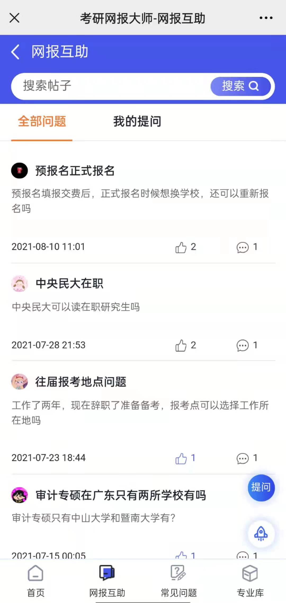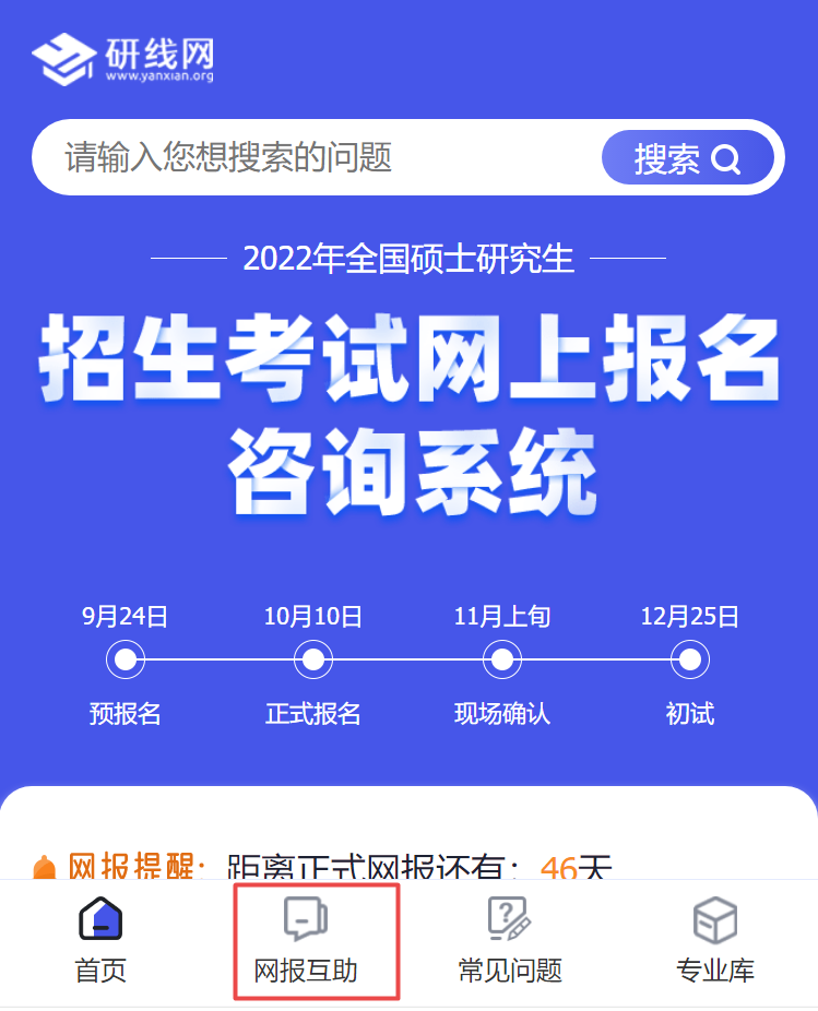 各位考生,考研網(wǎng)報(bào)至關(guān)重要,害怕信息填錯(cuò),不知道要準(zhǔn)備什么信息,可以在【考研網(wǎng)報(bào)大師】中和研友交流!首頁底部點(diǎn)擊 “網(wǎng)報(bào)互助”,可以查看研友的問題,幫助解答,也可以右側(cè)點(diǎn)擊“提問”,說出你的疑惑哦!