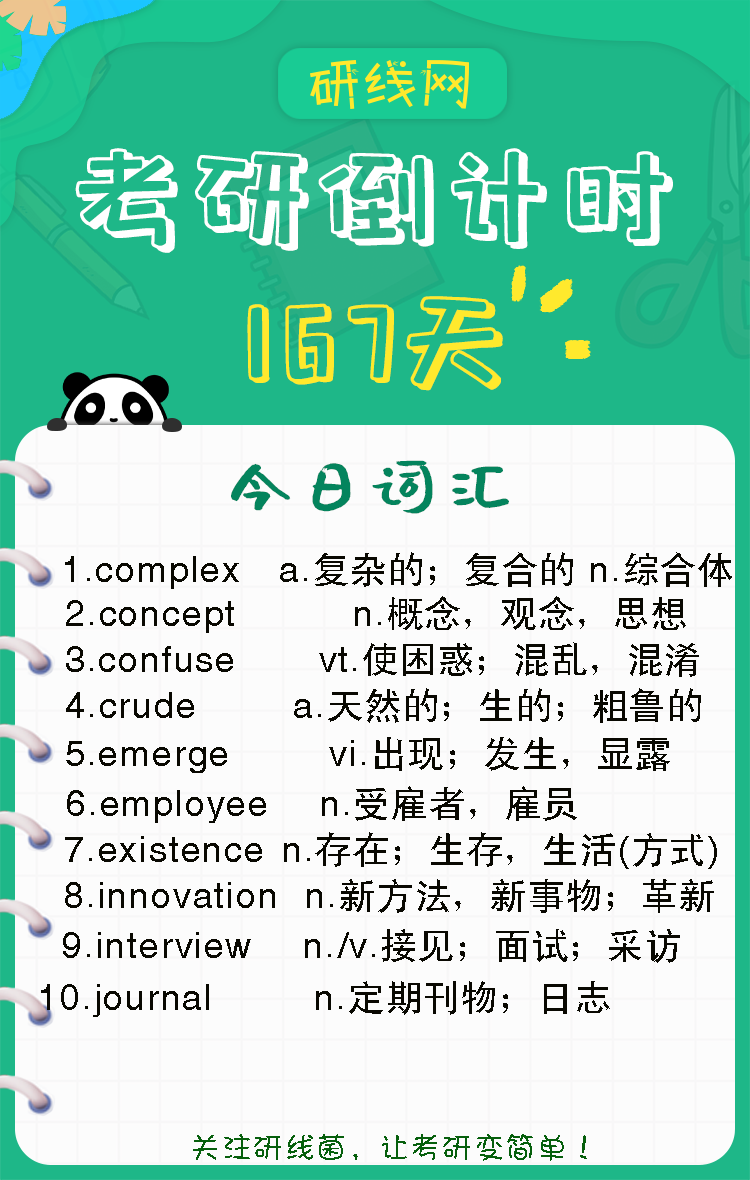 以上是研線網(wǎng)為考生整理的“2020考研英語(yǔ)詞匯高頻詞匯(18)”相關(guān)內(nèi)容,希望對(duì)大家有幫助,研線網(wǎng)小編預(yù)祝大家都能取得好成績(jī)!更多英語(yǔ)詞匯相關(guān)內(nèi)容盡在研線網(wǎng)!