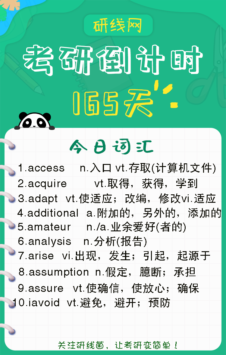 以上是研線網(wǎng)為考生整理的“2020考研英語詞匯高頻詞匯(21)”相關(guān)內(nèi)容,希望對大家有幫助,研線網(wǎng)小編預(yù)祝大家都能取得好成績!更多英語詞匯相關(guān)內(nèi)容盡在研線網(wǎng)!