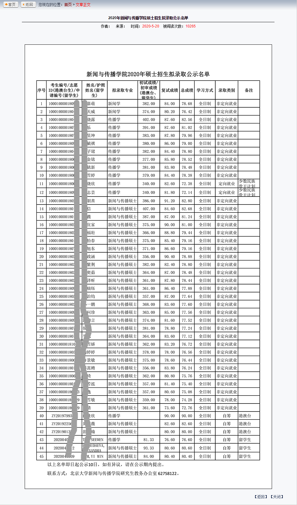 以上就是“2020考研擬錄取名單:北京大學新聞與傳播學院2020年新傳碩士擬錄取名單公示”的全部名單信息,同學們記得關注一下。考研加油!