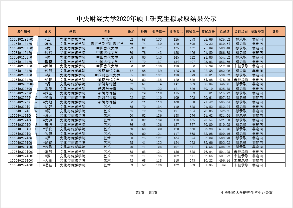 以上就是“2020考研擬錄取名單:中央財經大學文化與傳媒學院2020年新傳碩士擬錄取名單公示”的全部名單信息,同學們記得關注一下。考研加油!