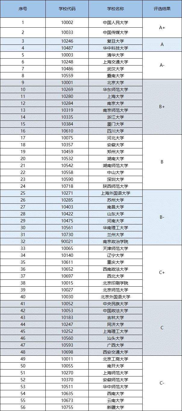 根據教育部學位與研究生教育發展中心最新發布的第四輪新聞傳播學專業學科評估結果顯示: