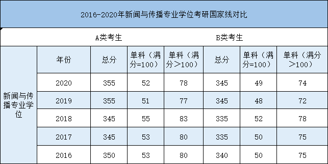 國家線是按一級學科類別給出的,以下是近五年的新聞與傳播專業學位的考研國家線: