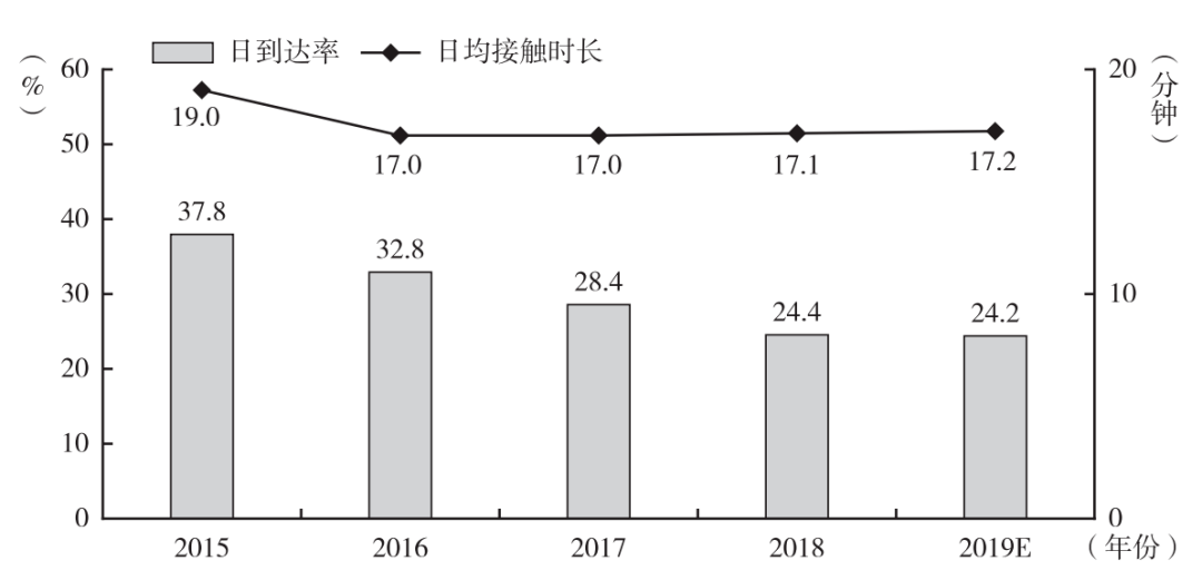 2015~2019年,報紙日到達率和日均接觸時長均呈下滑趨勢,預計2019年末,報紙日到達率將為24.2%,日接觸時長基本穩定在17分鐘(見圖7)。