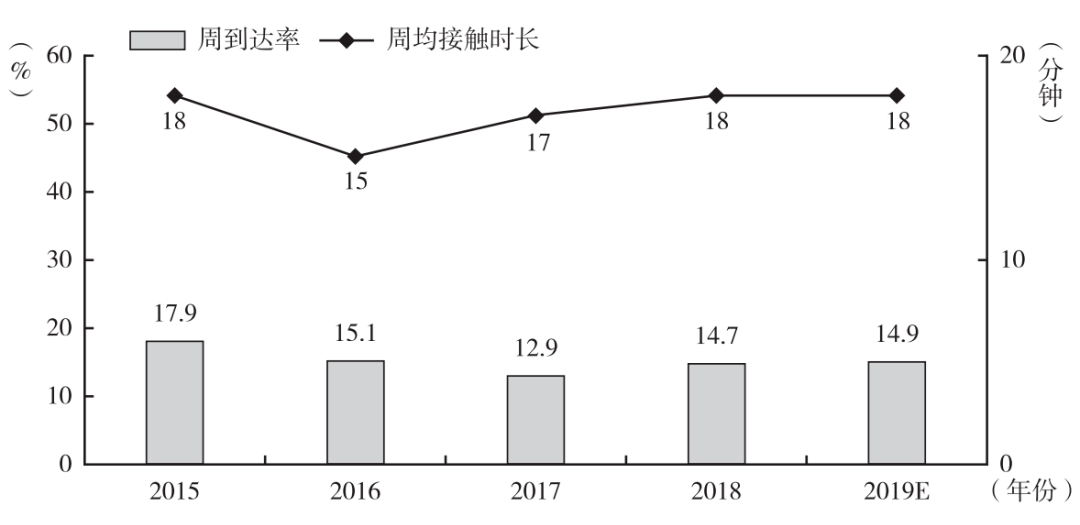 圖8:2015 ~ 2019 年雜志在城市居民中的周到達率及周均接觸時長