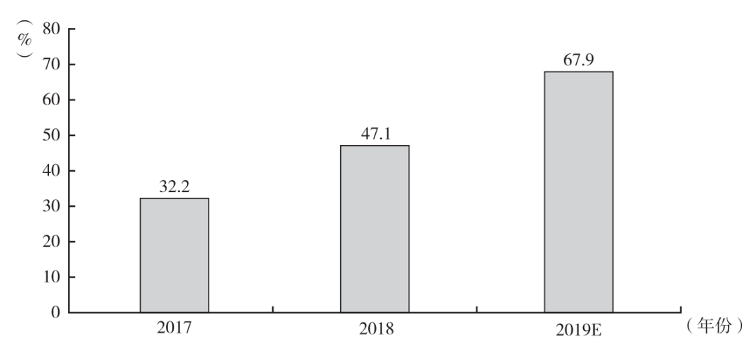 市場CNRS-TGI數據顯示,自2018年起,四線城市互聯網日到達率已經趕超一、二線城市,三線城市互聯網日到達率也在快速提升,一、二線城市互聯網市場日趨飽和。預計2019年末,三線城市互聯網日到達率為78.9%,較2018年提升1.1個百分點,四線城市互聯網日到達率為83.1%,較2018年提升0.8個百分點,同時三、四線城市下沉市場互聯網日到達率增幅遠超一、二線城市(見圖1)。