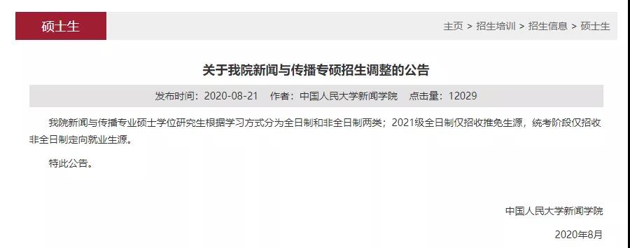 人大新聞與傳播專業碩士學位研究生根據學習方式分為全日制和非全日制兩類;2021級全日制僅招收推免生源,統考階段僅招收非全日制定向就業生源。