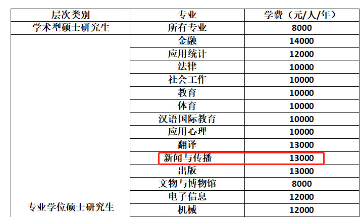 全日制專業(yè)學(xué)位碩士研究生學(xué)費(fèi):1.3萬(wàn)元/生·年