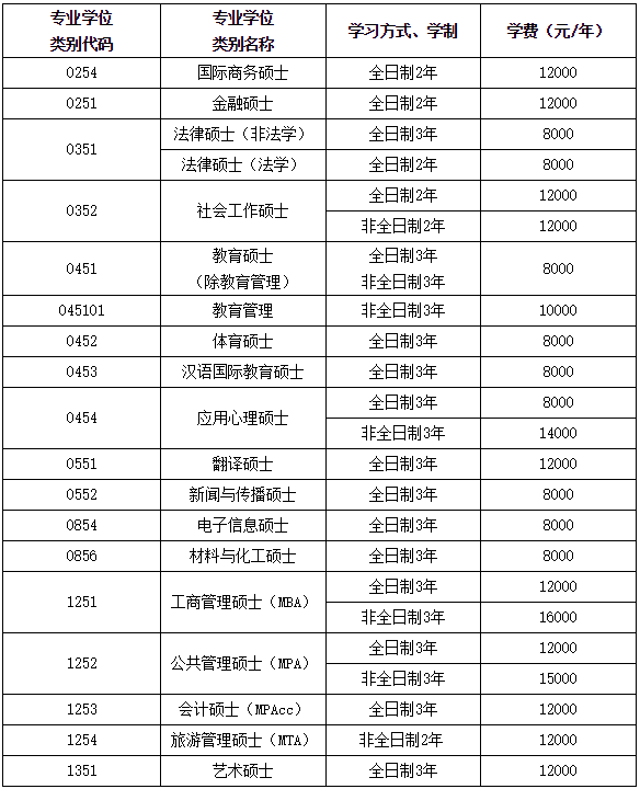 學(xué)術(shù)型碩士學(xué)習(xí)方式全部為全日制,學(xué)制3年,每學(xué)年學(xué)費(fèi)8000元;各專業(yè)型碩士學(xué)習(xí)方式、學(xué)制及學(xué)費(fèi)見下表: