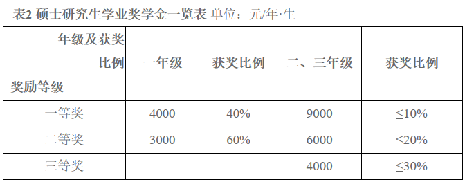 2.研究生學業獎學金:等級、獲獎比例、獎勵標準見表2。