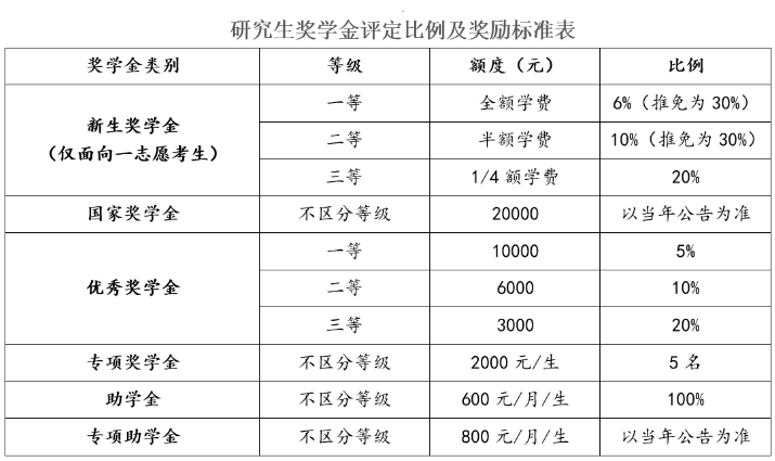 我院為碩士研究生提供豐富的獎(jiǎng)助學(xué)金,獎(jiǎng)助體系基本情況如下表所示: