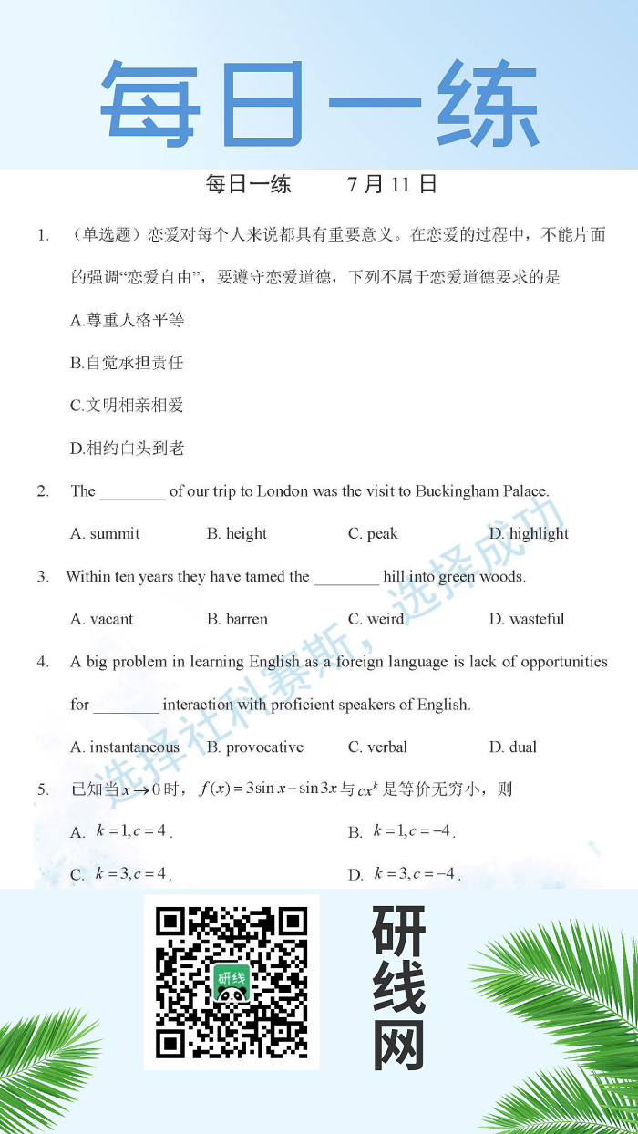 為了更好的復習和鞏固已經學過的知識,研線網小編為大家整理出幾道題,作為每日的練習,希望能夠幫助到同學們哦!
