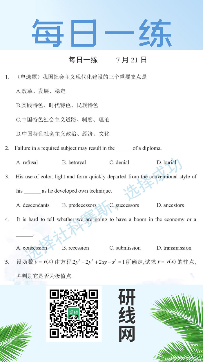 以上就是今日每日一練的全部內(nèi)容,跟著每日一練,考研輕松復(fù)習(xí)!更多考試練習(xí),點擊考研每日一練!