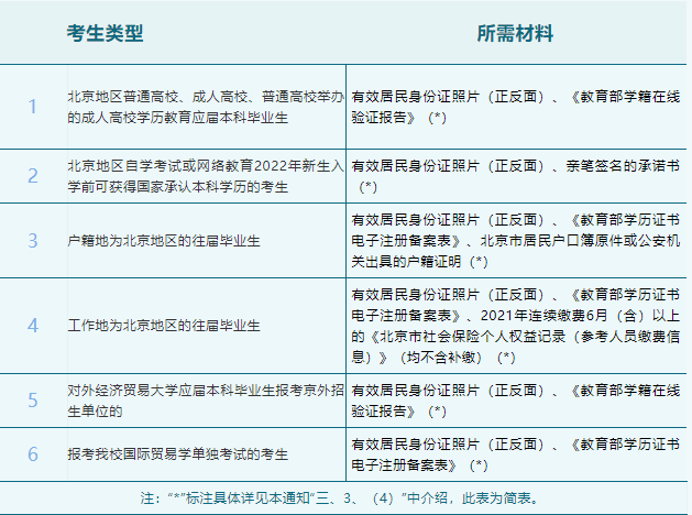 2.報(bào)考對(duì)外經(jīng)濟(jì)貿(mào)易大學(xué)或商務(wù)部國(guó)際經(jīng)濟(jì)貿(mào)易研究院的其他考生:具有在京戶(hù)籍(須提供北京市居民戶(hù)口簿首頁(yè)及本人頁(yè)原件照片或北京市集體戶(hù)口首頁(yè)及本人頁(yè)原件照片或北京市公安機(jī)關(guān)出具的戶(hù)籍證明原件照片);或工作所在地在京(須2021年在北京連續(xù)繳納6個(gè)月(含)以上社會(huì)保險(xiǎn)中的基本養(yǎng)老保險(xiǎn)或基本醫(yī)療保險(xiǎn)(均不含補(bǔ)繳))。