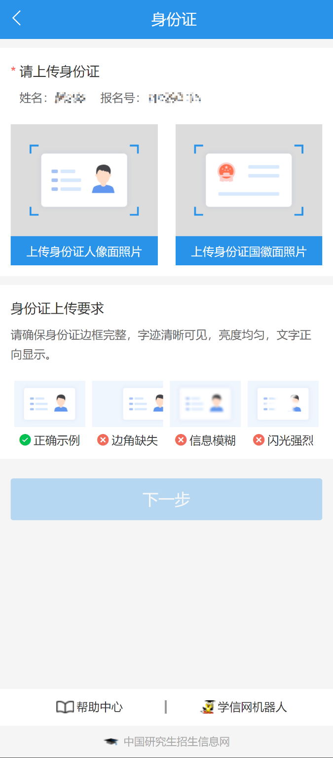 (2)考生本人居民身份證原件正反面圖片(有效期內身份證人像面、本人身份證國徽面)。分正、反面兩張上傳,請確保身份證邊框完整,字跡清晰,亮度均勻。