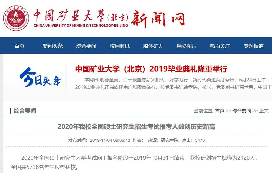 2020年全國碩士研究生入學考試網上報名階段于2019年10月31日結束,我校計劃招生規模為2120人,全國共5738名考生報考我校。
