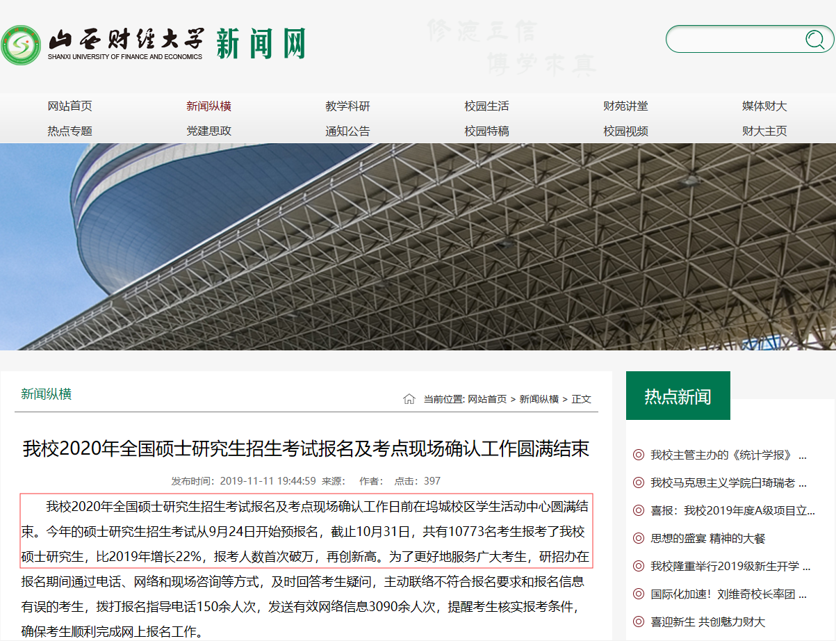 按照省招生考試中心的統一部署,從2019年11月5日至8日,我校2020年全國碩士研究生招生考試現場確認工作在學生活動中心一層順利進行。為方便我校報名的應屆畢業生考生現場確認,確保工作順利開展,研究生院提前在部門官方網站發布現網上報名公告和場確認公告。根據校領導指示,研究生院精心準備,制定了詳細的現場確認工作方案,對現場確認的流程、關鍵節點、責任人等都做了周密安排,設立了資格審查、學生證及身份證驗證、圖像采集、打印復印、信息確認、表格回收與數據整理、秩序維持、后勤保障等多個工作小組,進行了指示標志設立、設備調試和工作人員專門培訓。在確認現場,工作人員服務熱情周到,工作認真負責,各司其職,每個環節井然有序,平穩順利,確保了考生填寫信息無誤,數據準確完整。研究生院還在現場醒目位置懸掛了“2020年全國碩士研究生招生考試山西財經大學報考點”橫幅,張貼了《國家教育考試違規處理辦法》、《中華人民共和國刑法修正案(第九條)》等警示教育張貼畫,教育考生誠信考試,拒絕作弊,全部考生簽署了《考生誠信考試承諾書》。