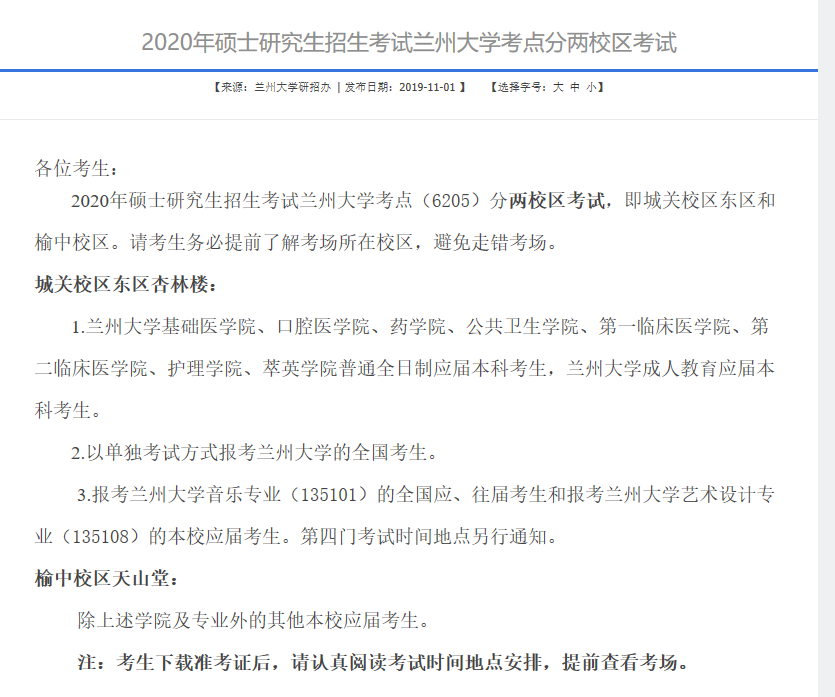 2020年碩士研究生招生考試蘭州大學考點(6205)分兩校區考試,即城關校區東區和榆中校區。請考生務必提前了解考場所在校區,避免走錯考場。