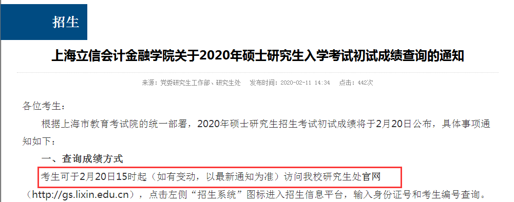 以上就是“2020考研初試成績(jī):上海立信會(huì)計(jì)金融學(xué)院初試成績(jī)可于2月20日查詢碩士研究生初試成績(jī)”的全部?jī)?nèi)容,祝考研成功!