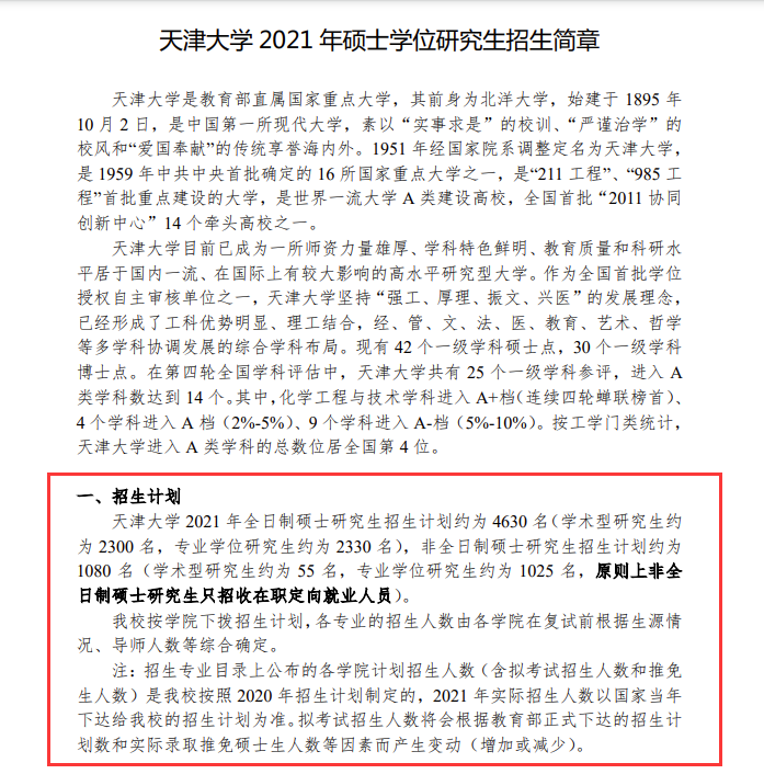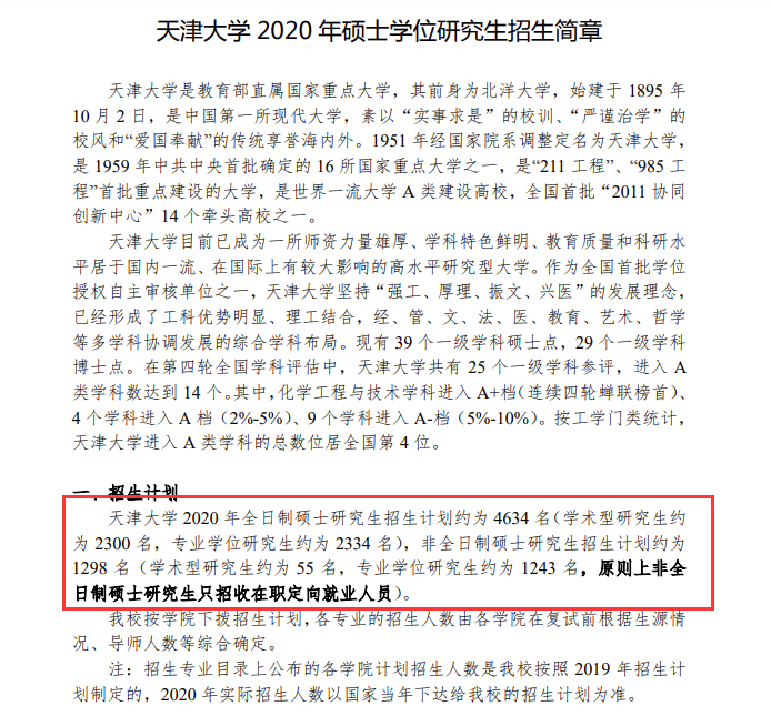 天津大學(xué)2020年全日制研究生招生計劃約為4634名,2021年全日制招生計劃約為4630名,同比減少4名,4名主要為專業(yè)學(xué)位研究生的減少。