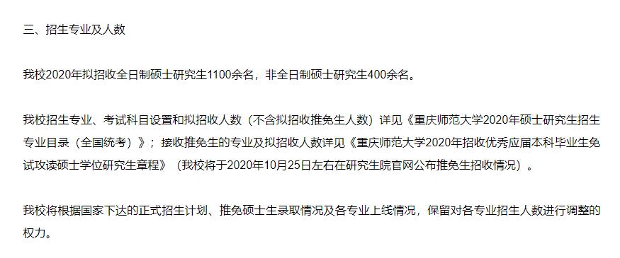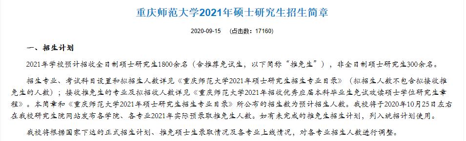 重慶師范大學2020年研究生招生計劃約為1100名,2021年全日制招生計劃約為1800名,同比增長700名。