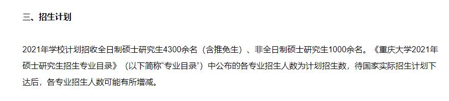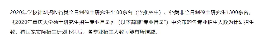 重慶大學(xué)2020年研究生招生計劃約為5400名,2021年招生計劃約為5300名,同比減少100名。