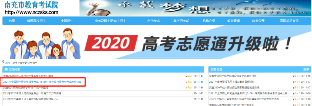 報考點為院校則可以搜索該院校的研究生院或研究生招生信息網(wǎng),找到碩士招生欄目或通知公告欄目。